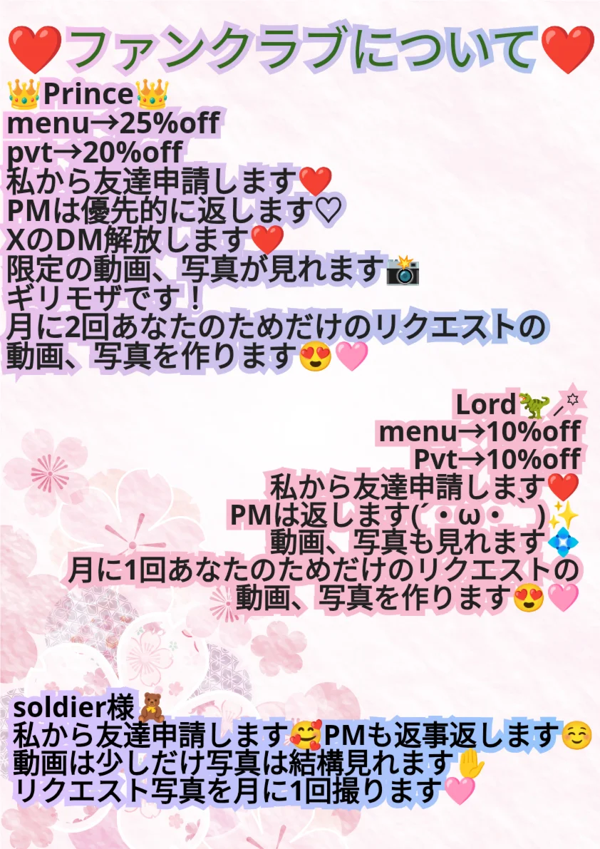 ✨基本的にはマスクします! チケチャもしくはルーレットの当たりの時は取ります。 ✨パブは手ぶらまでです。 ✨チケチャを60tkにします。【たまにしかいかない⠀】 限定推奨🤍 自発的にパンツ脱ぎません。 リクエストしてください🫡